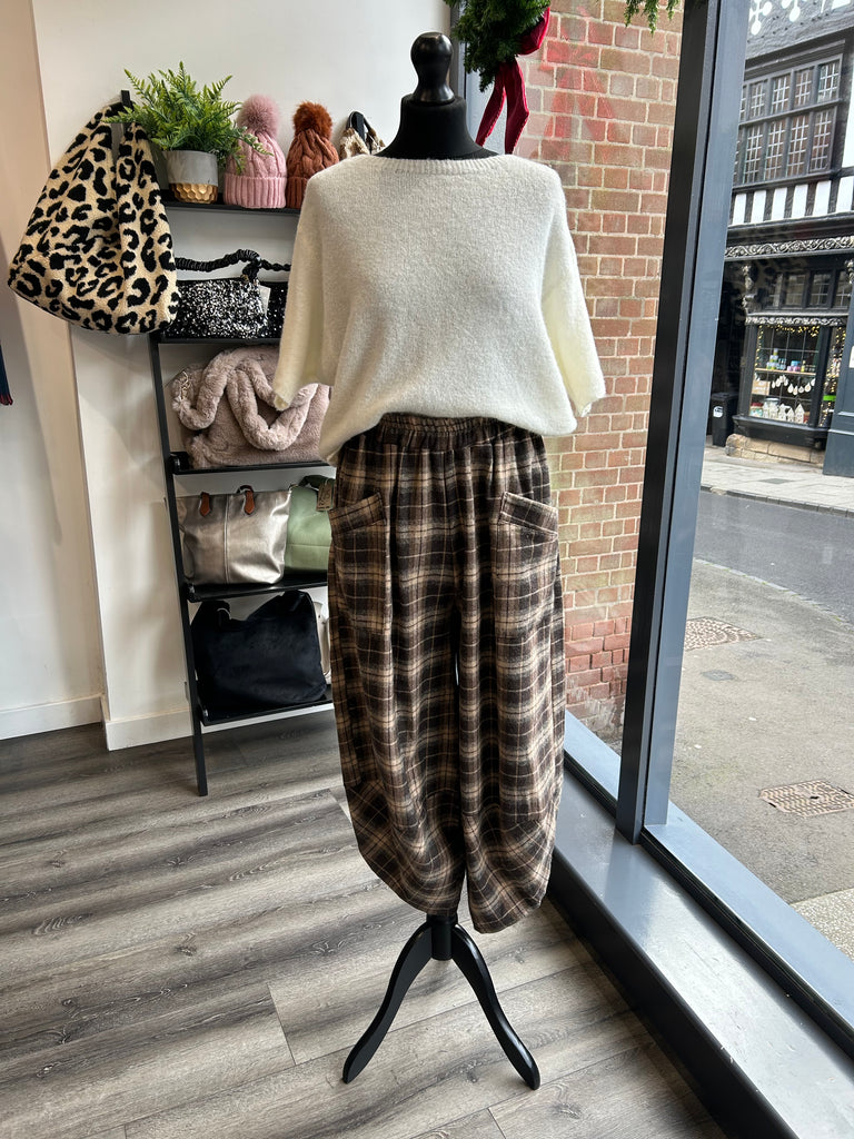 Checked Balloon Leg Trousers- Chocolate