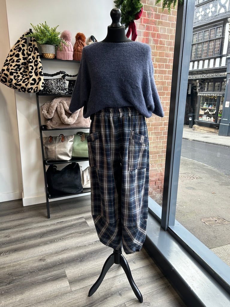 Checked Balloon Leg Trousers - Navy